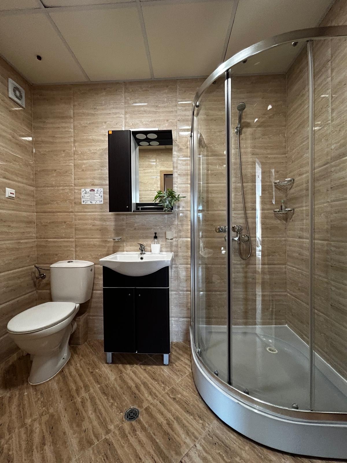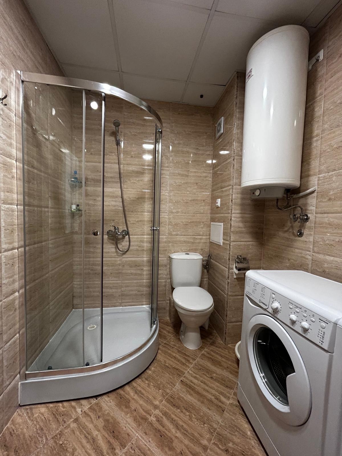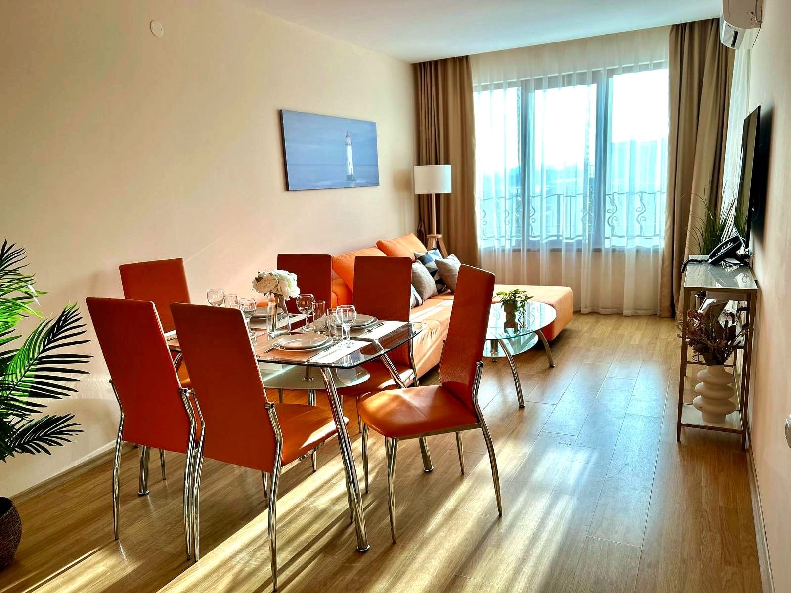 The apartment features a cozy living room with a sofa bed, a kitchenette, two bedrooms: first with a wide double bed, second with two single beds, two bathrooms with a shower. It is prepared to comfortably accommodate up to 6 guests.