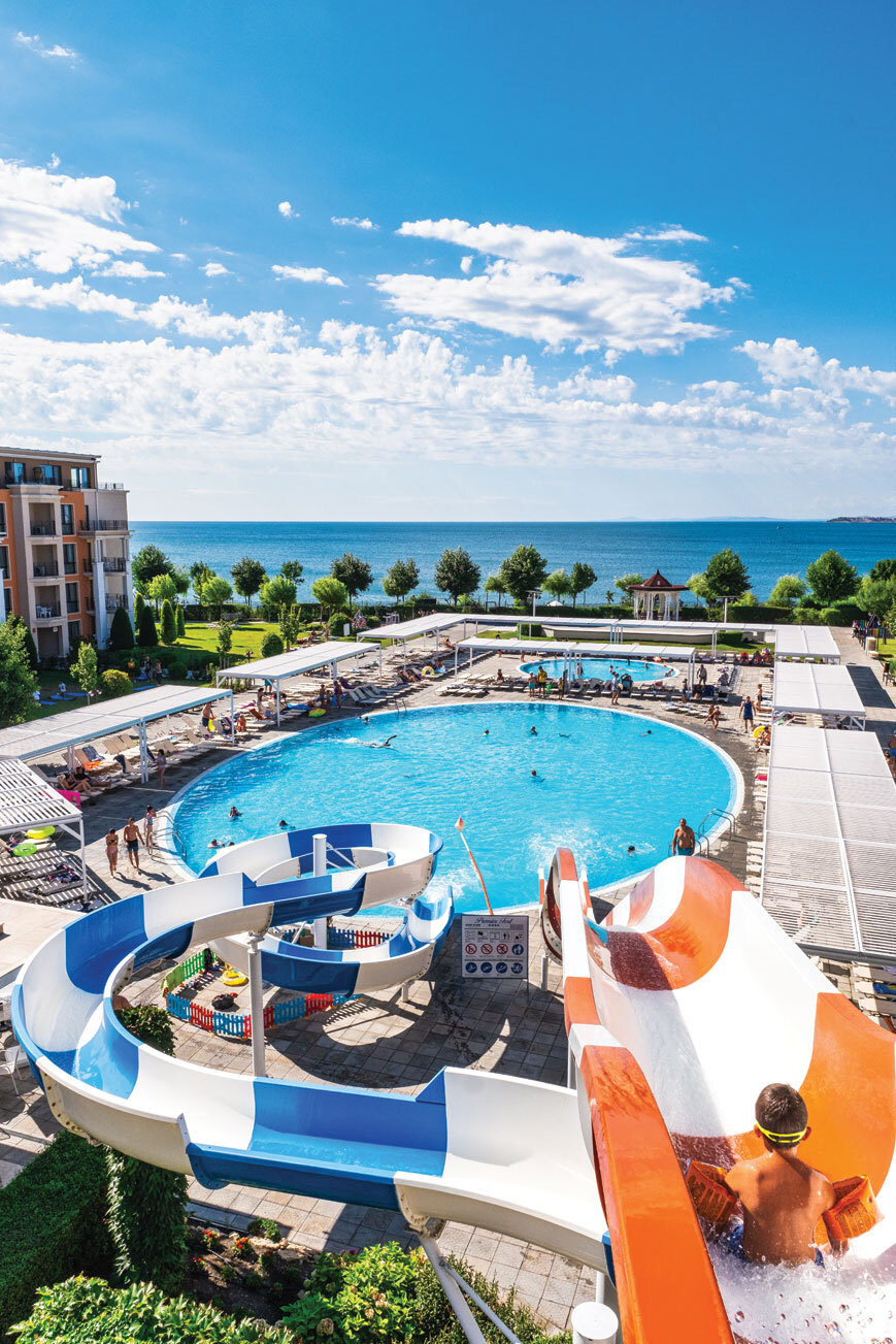 Premier Fort Beach is a family-friendly complex located on the first line of the Black Sea coast in the town of Sveti Vlas, right next to a sandy beach. The property stands out with its elegant architecture, well-maintained gardens, and extensive recreational facilities. Guests can enjoy several swimming pools (including a children’s area with water slides), a fitness center, spa, restaurants, and family entertainment programs. It is a gated, year-round resort designed as a relaxed seaside retreat for families, combining a peaceful beachfront location with the rich amenities and comfort typical of modern resorts along the Bulgarian coast.