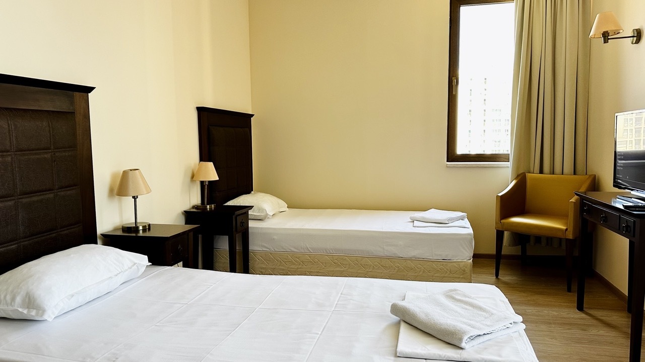 W studiu znajduje się wygodne łóżko dwuosobowe oraz rozkładana kanapa dla trzeciej osoby. W jego skład wchodzi też balkon z widokiem na zieloną część miasta. Studio posiada aneks kuchenny, stół z krzesłami, a także sporej wielkości łazienkę z prysznicem. Może ono pomieścić maksymalnie 3 osoby.