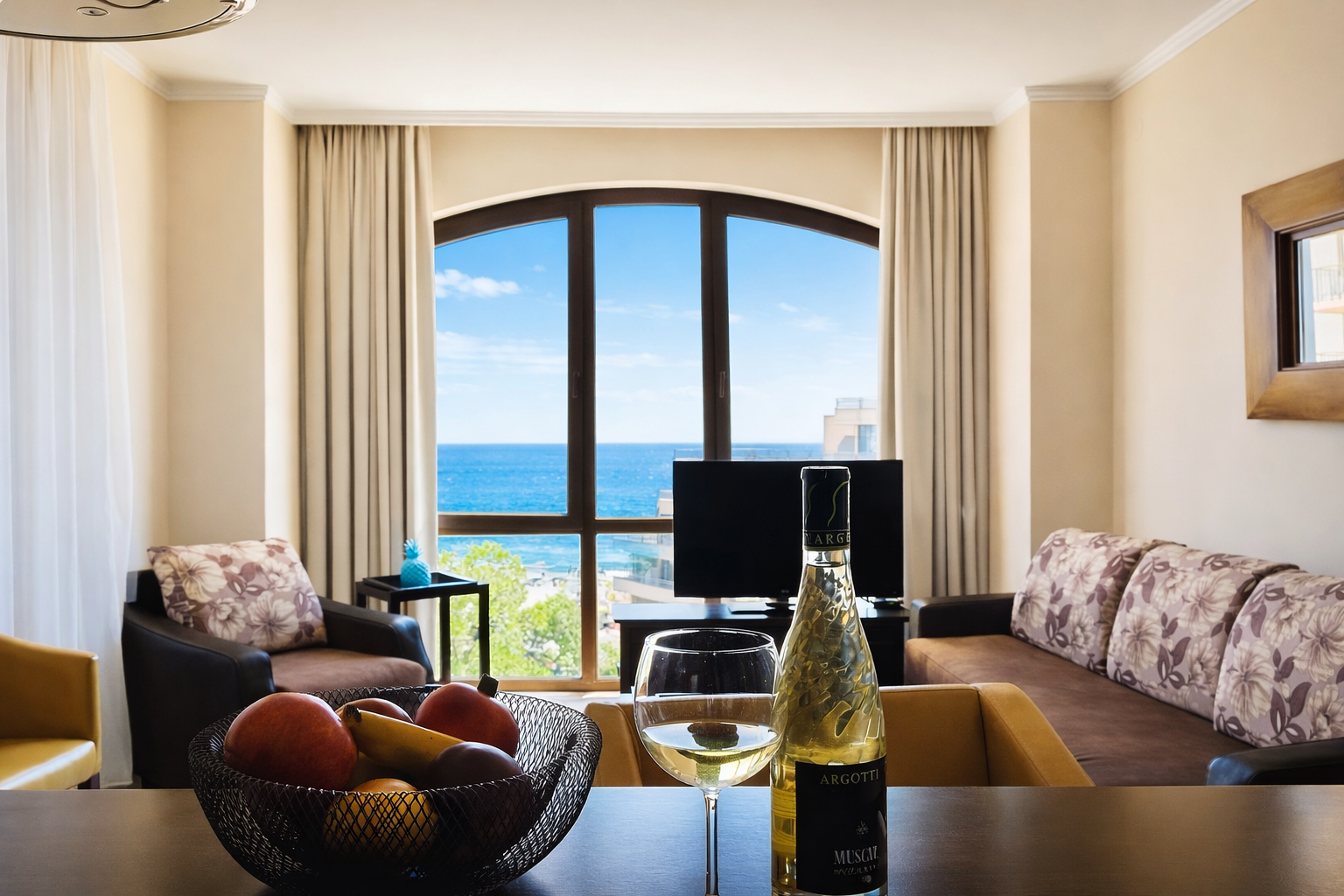 W apartamencie F806 znajduje się klimatyzacja, piekarnik, płyta kuchenna, czajnik elektryczny, płaski telewizor, przestronne okno z widokiem na morze, bezpłatne WIFI.